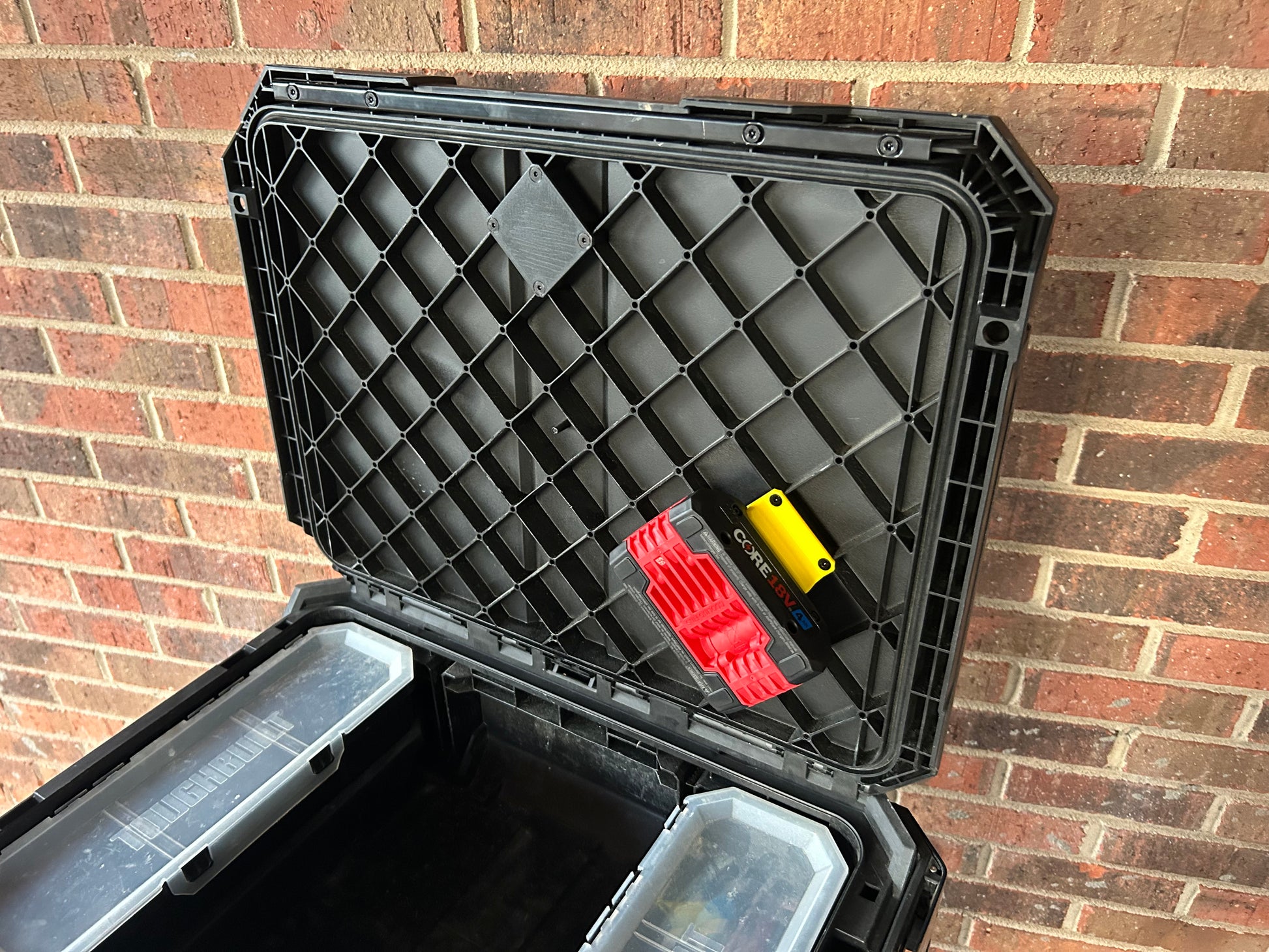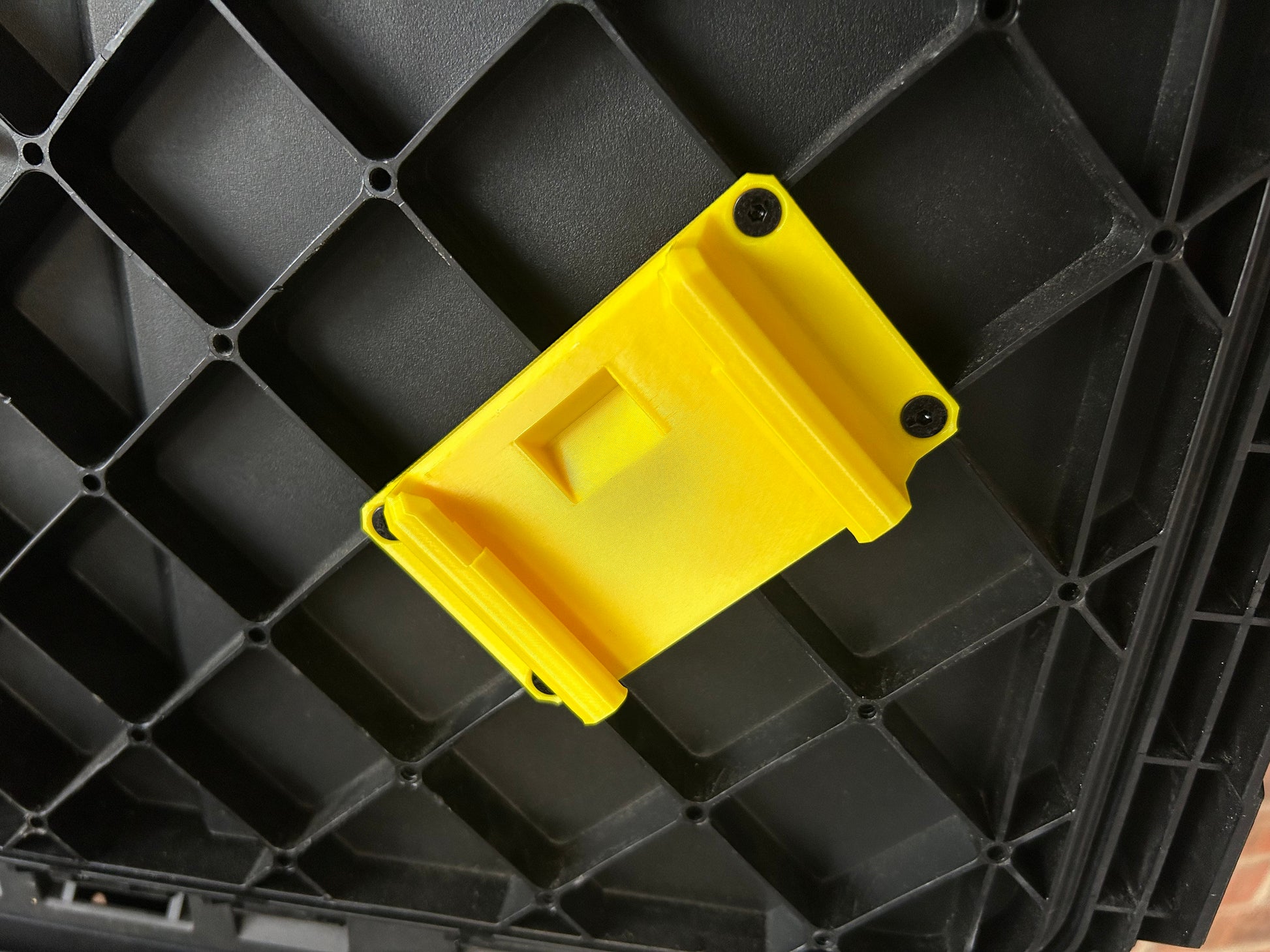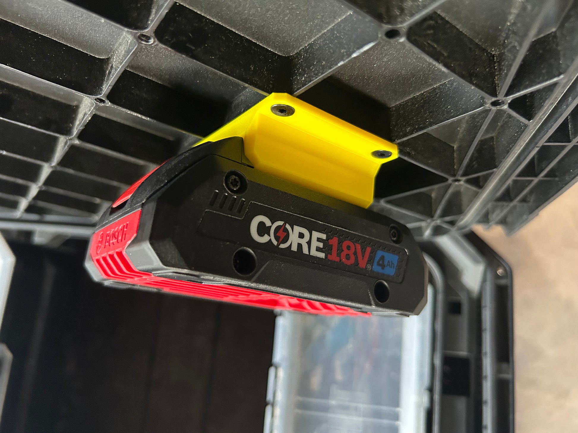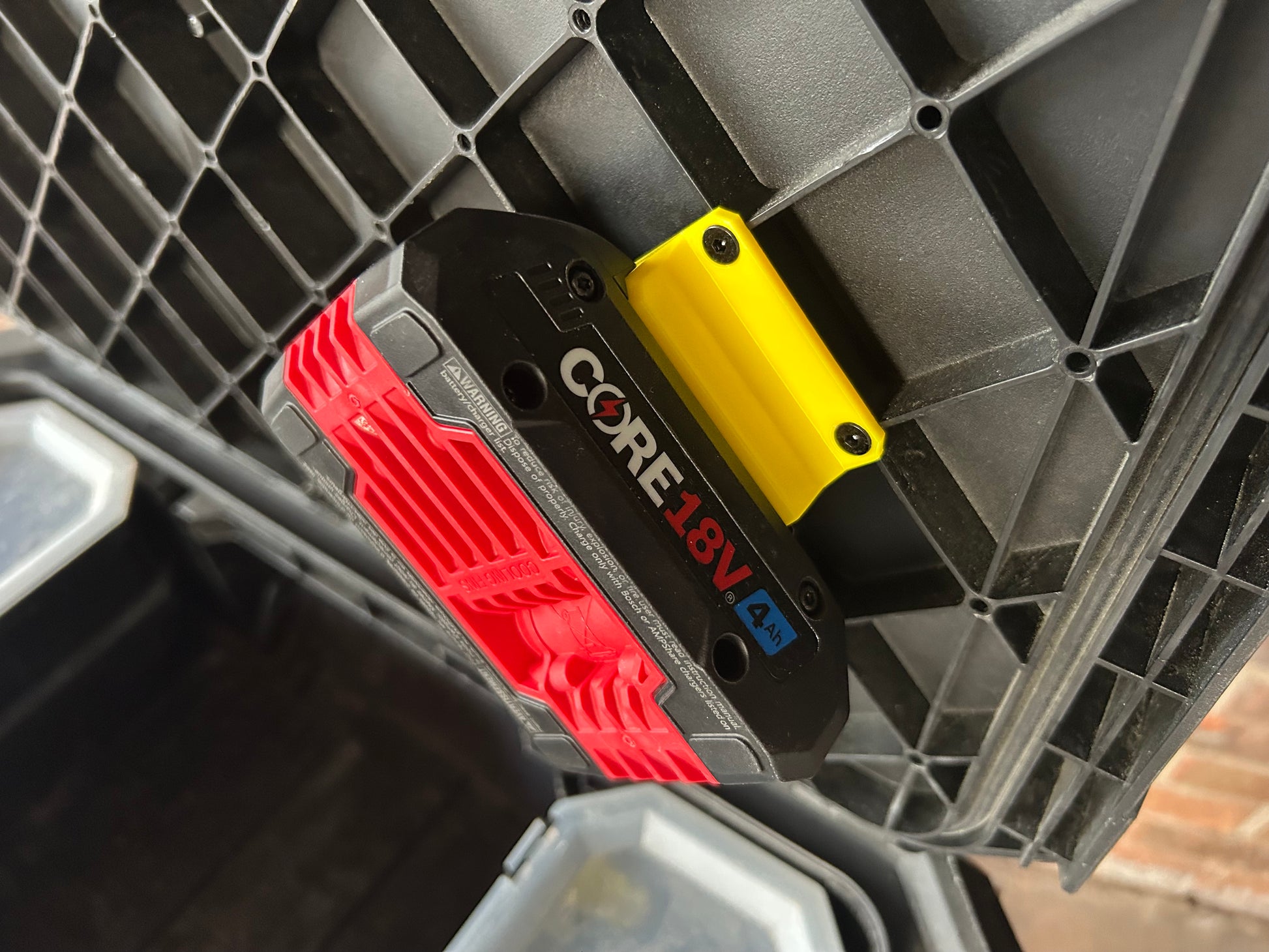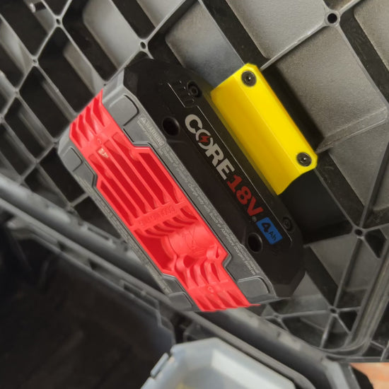 This Battery Mount for the Bosch 18v battery, designed for the ToughBuilt StackTech system, is crafted from durable ABS material. It features a four-point screw design that fastens securely to the pre-existing holes under the lid of your boxes. The angled design ensures easy access, making it simpler to lift out the Bosch 18v battery from its holster. Perfect for organizing and securing your Bosch 18v batteries in any ToughBuilt StackTech setup.