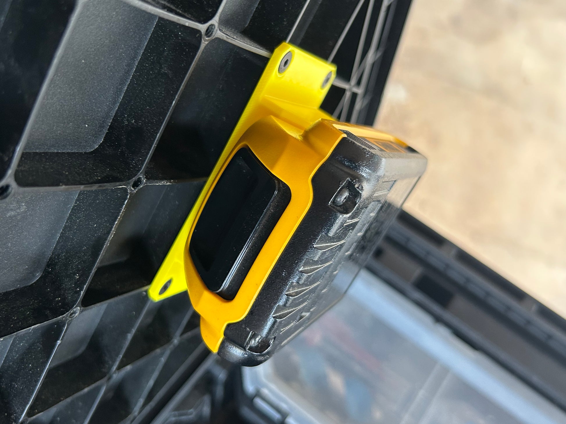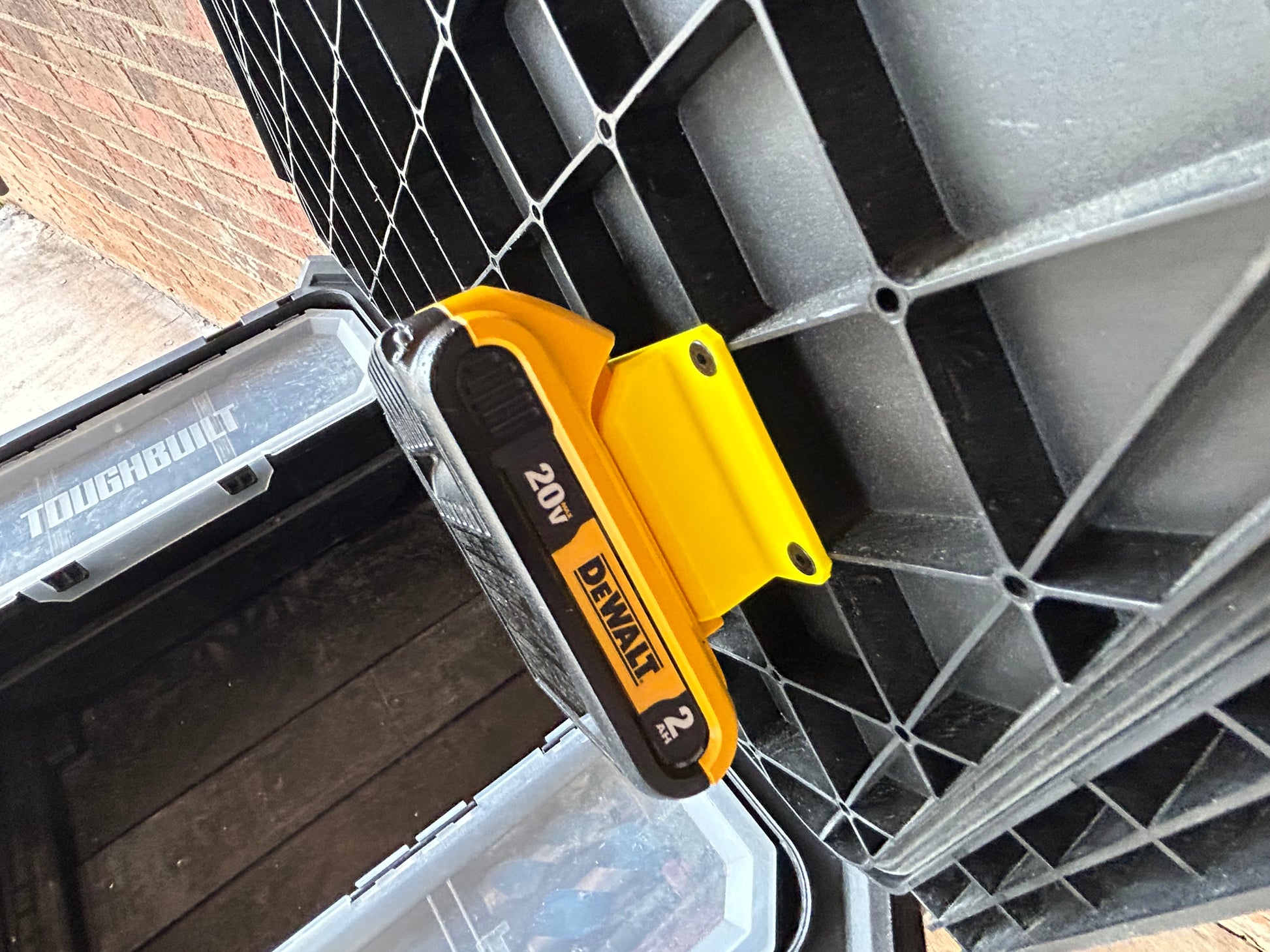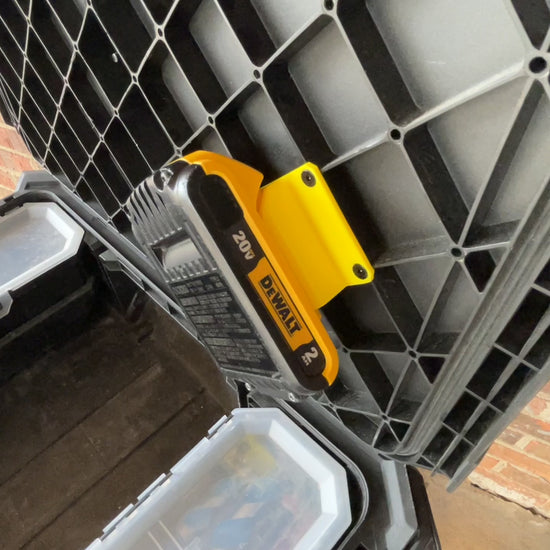 This Battery Mount for the Dewalt 20v/60v battery, designed for the ToughBuilt StackTech system, is crafted from durable ABS material. It features a four-point screw design that fastens securely to the pre-existing holes under the lid of your boxes. The angled design ensures easy access, making it simpler to lift out the Dewalt 20v/60v battery from its holster. Perfect for organizing and securing your Dewalt 20v/60v batteries in any ToughBuilt StackTech setup.