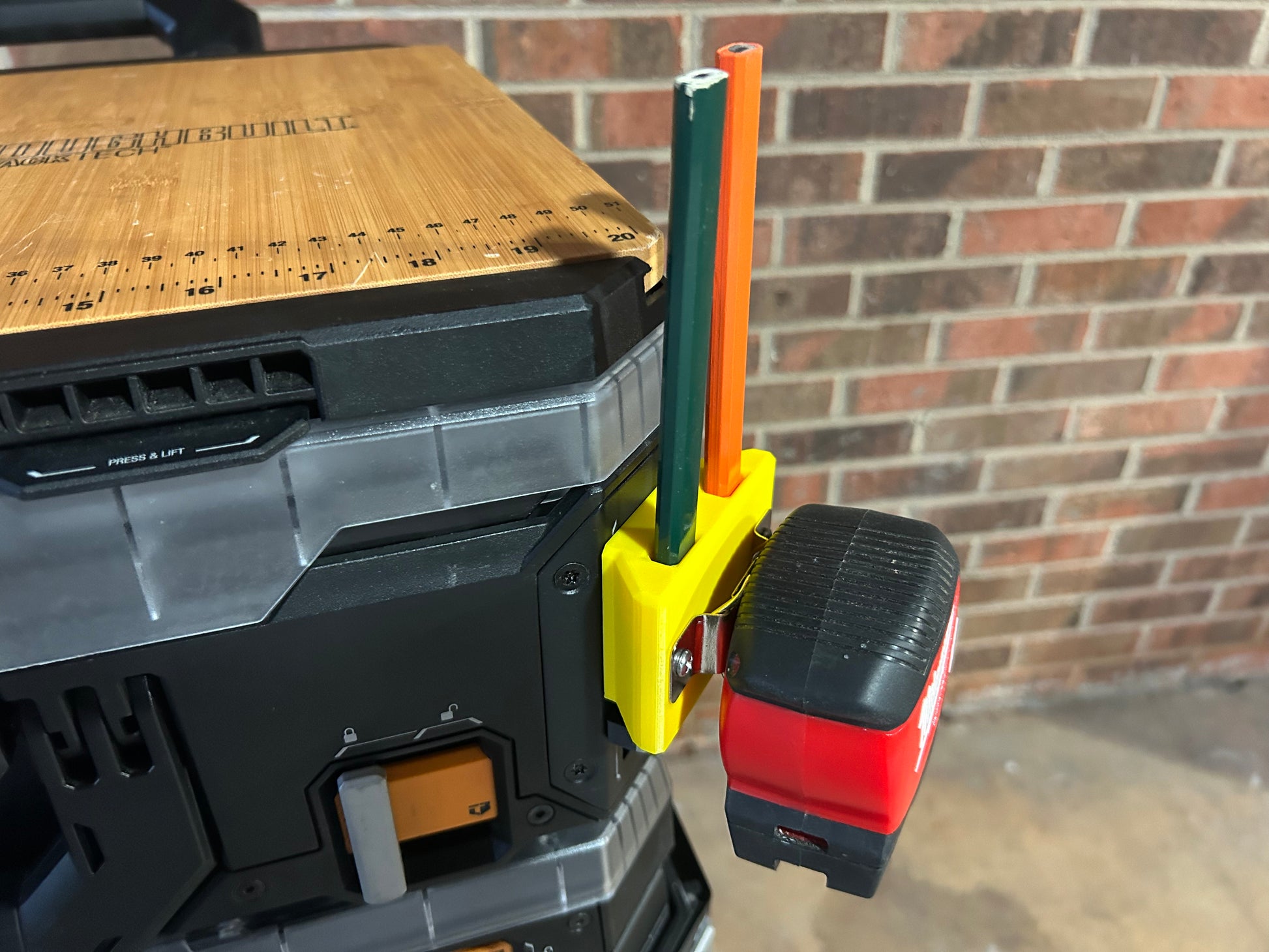 A steel bracket, securely fastened to the body, provides a dedicated mount for your measuring tape, ensuring quick access and secure storage. The integrated carpenter’s pencil holders keep your marking tools within reach, while the versatile design allows for power tool attachment using a belt clip, making it a multi-purpose solution for professionals and DIYers alike.